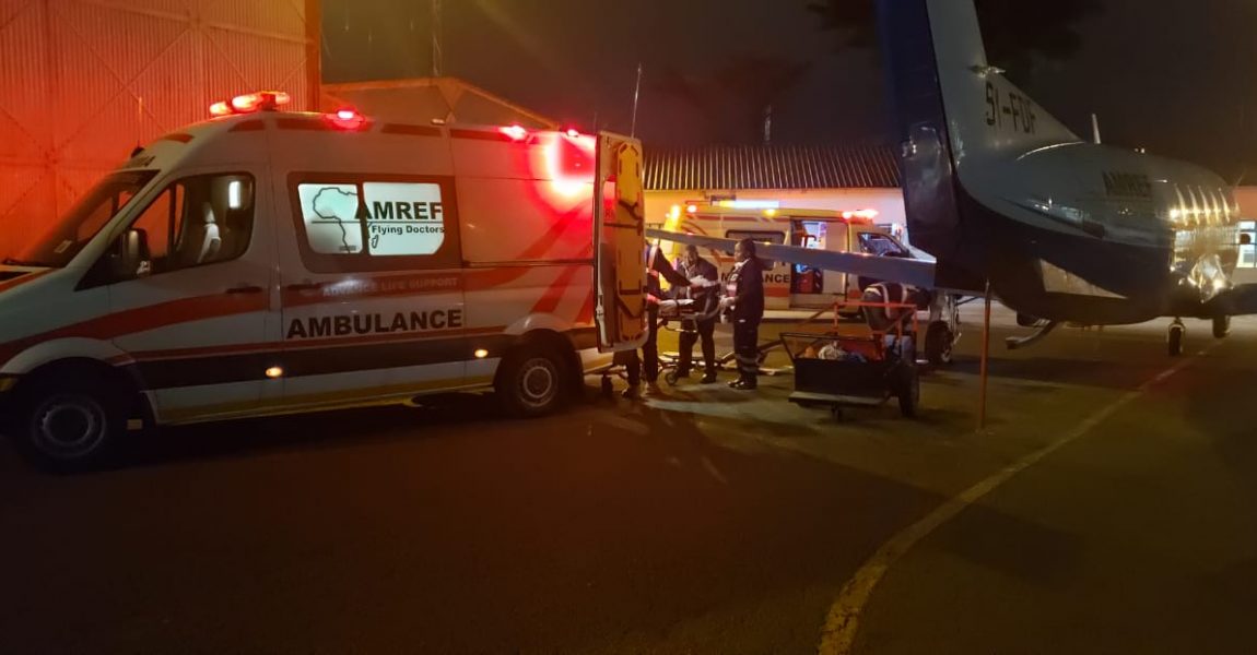 The AMREF Flying Doctors aircraft landed at Wilson Airport at 21h00, and the patients rushed to Kenyatta National Hospital in AMREF Flying Doctors’ Advanced Life Support Ground Ambulance in a critical condition and were later handed to Kenyatta National Hospital.